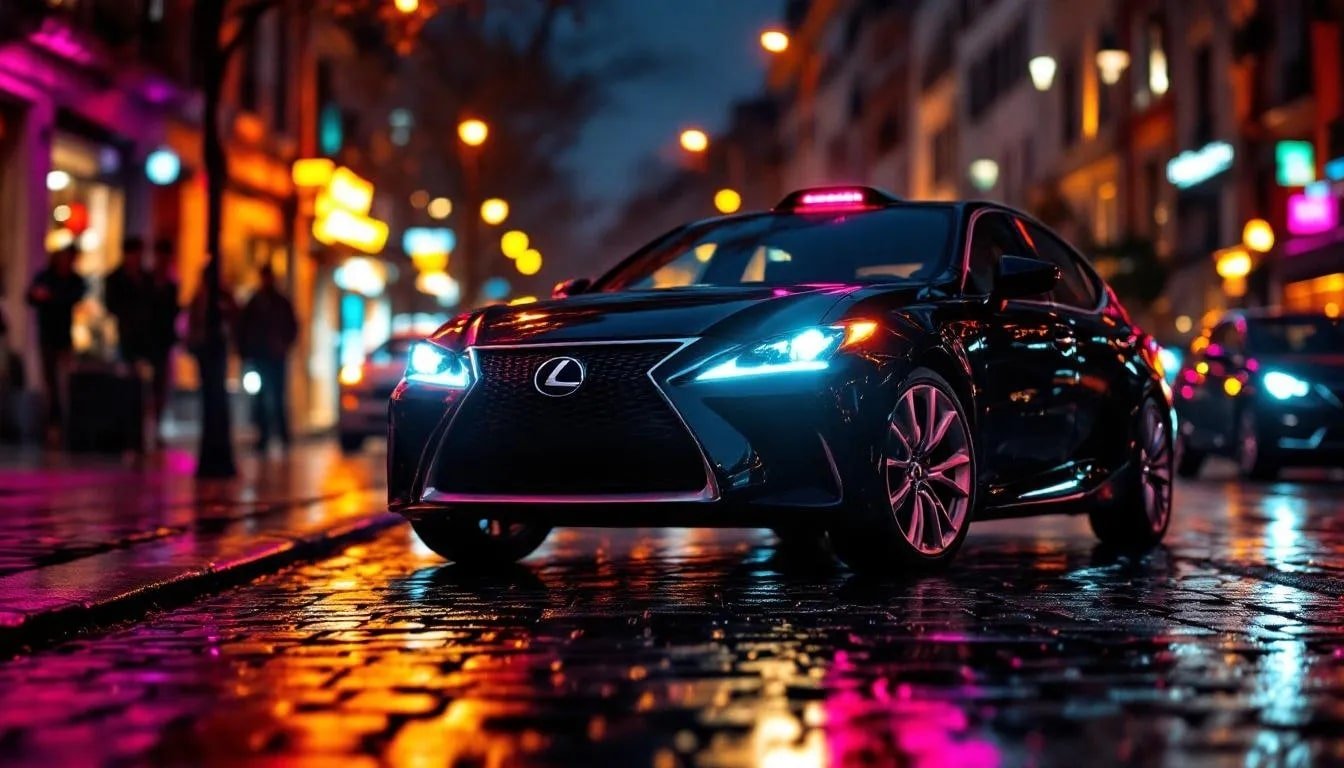Un taxi moderne en attente sur une rue de Toulouse la nuit, avec des lumières de la ville en arrière-plan, symbolisant un retour en toute sécurité après une sortie nocturne